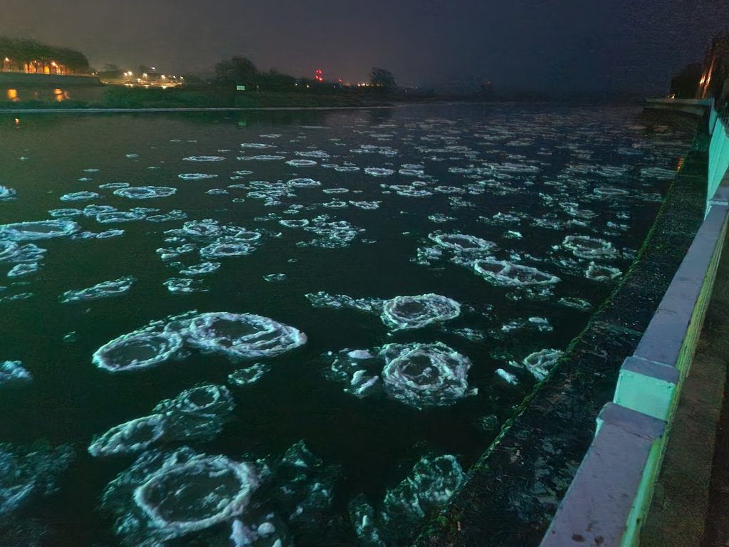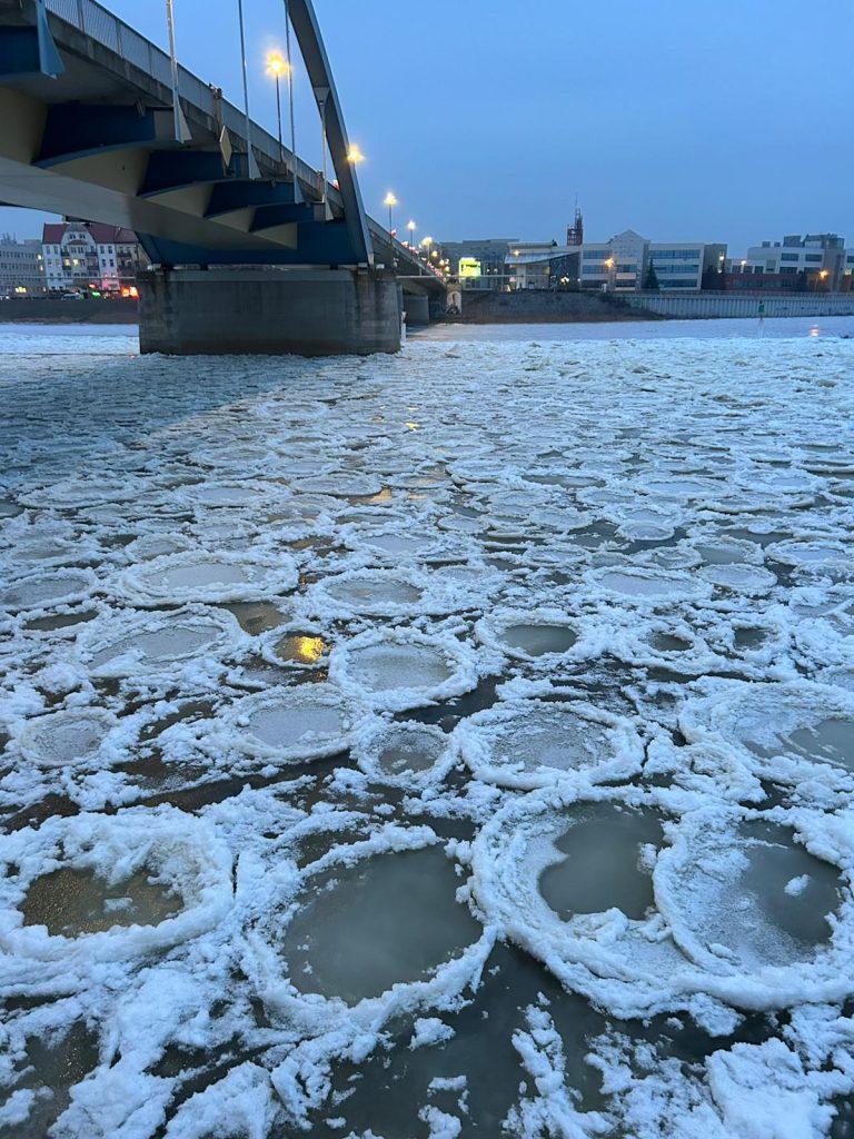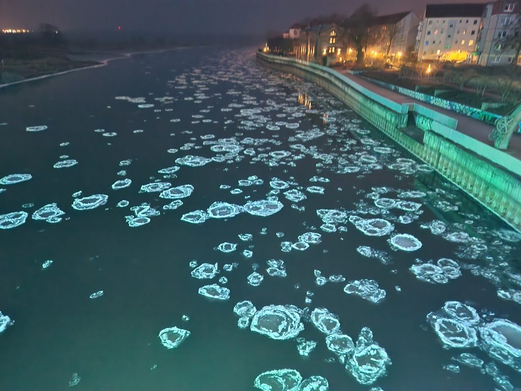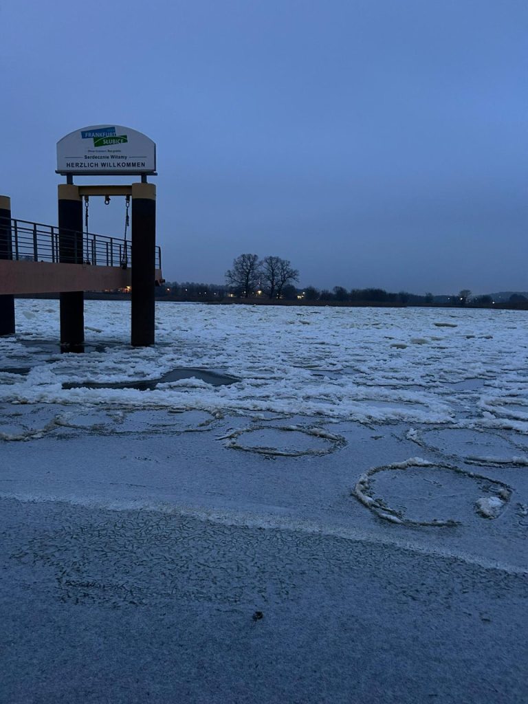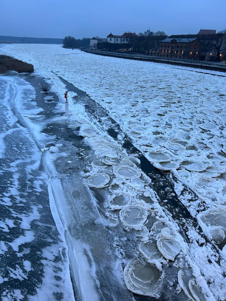 Es handelt sich nicht um lebendige Tiere, sondern um kreisförmige Eisschollen, die bei starkem Frost auf der Oder treiben. In anderen Regionen nennt man sie auch „Pfannkucheneis“.