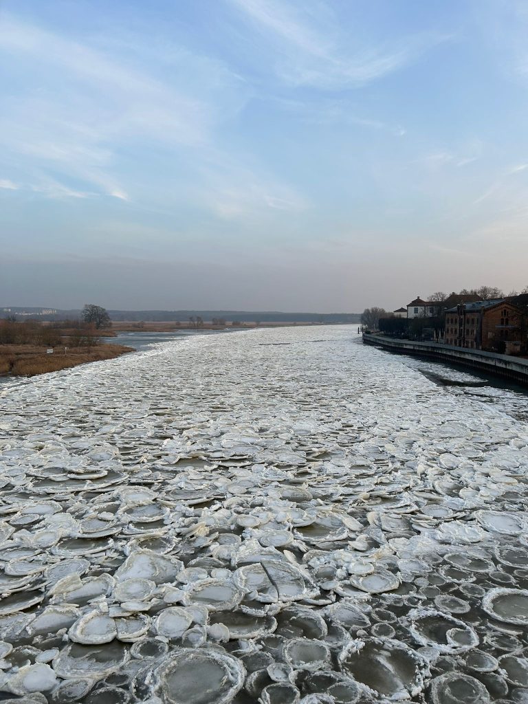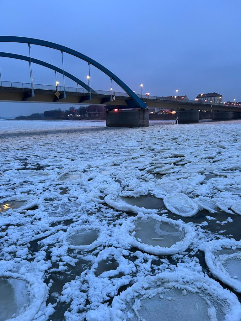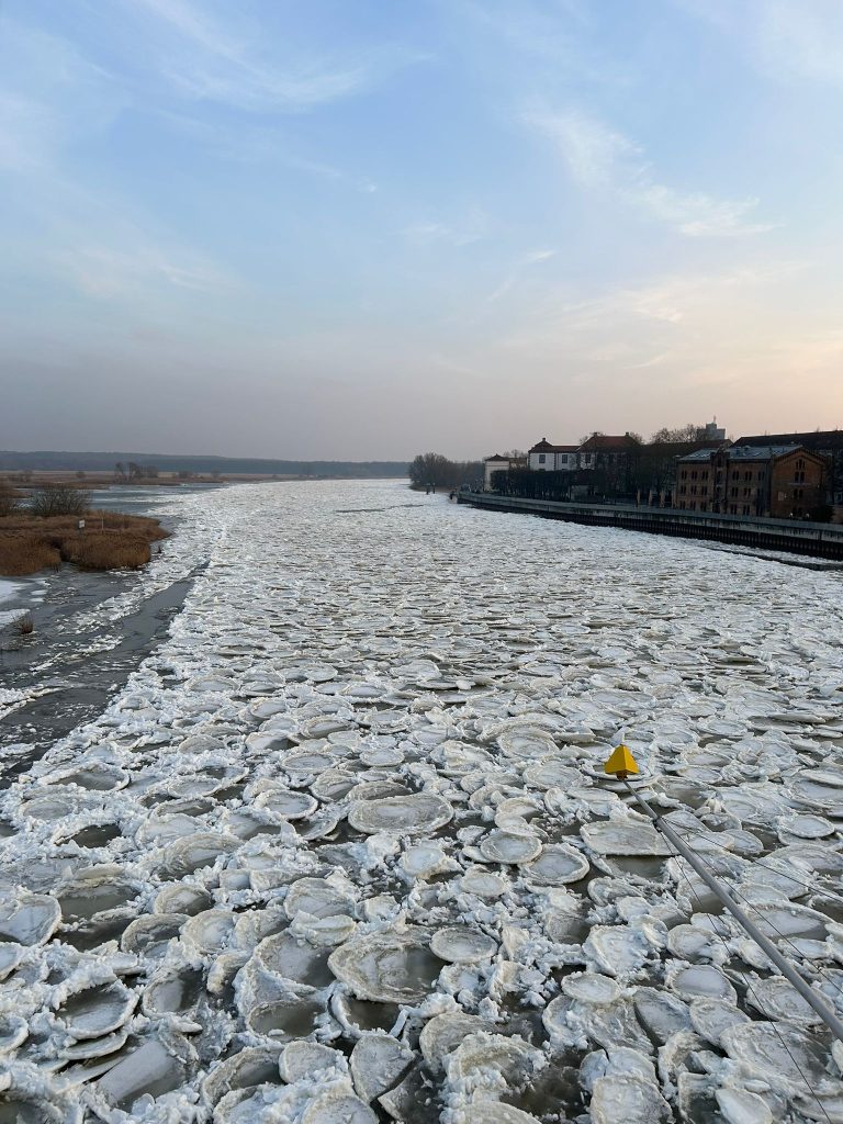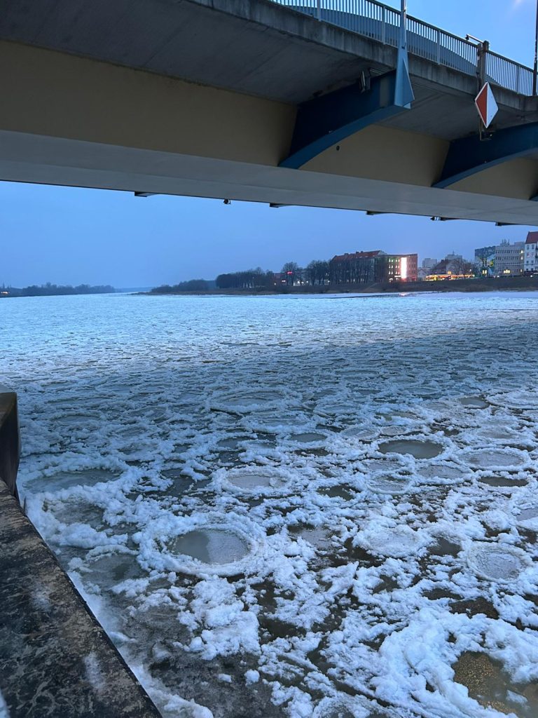 Damit Pfannkucheneis entsteht, muss das Wasser turbulent sein. In der Oder sorgt die Strömung dafür, dass das Wasser unterkühlt wird (< 0 °C), ohne sofort zu einer festen Decke zu gefrieren.